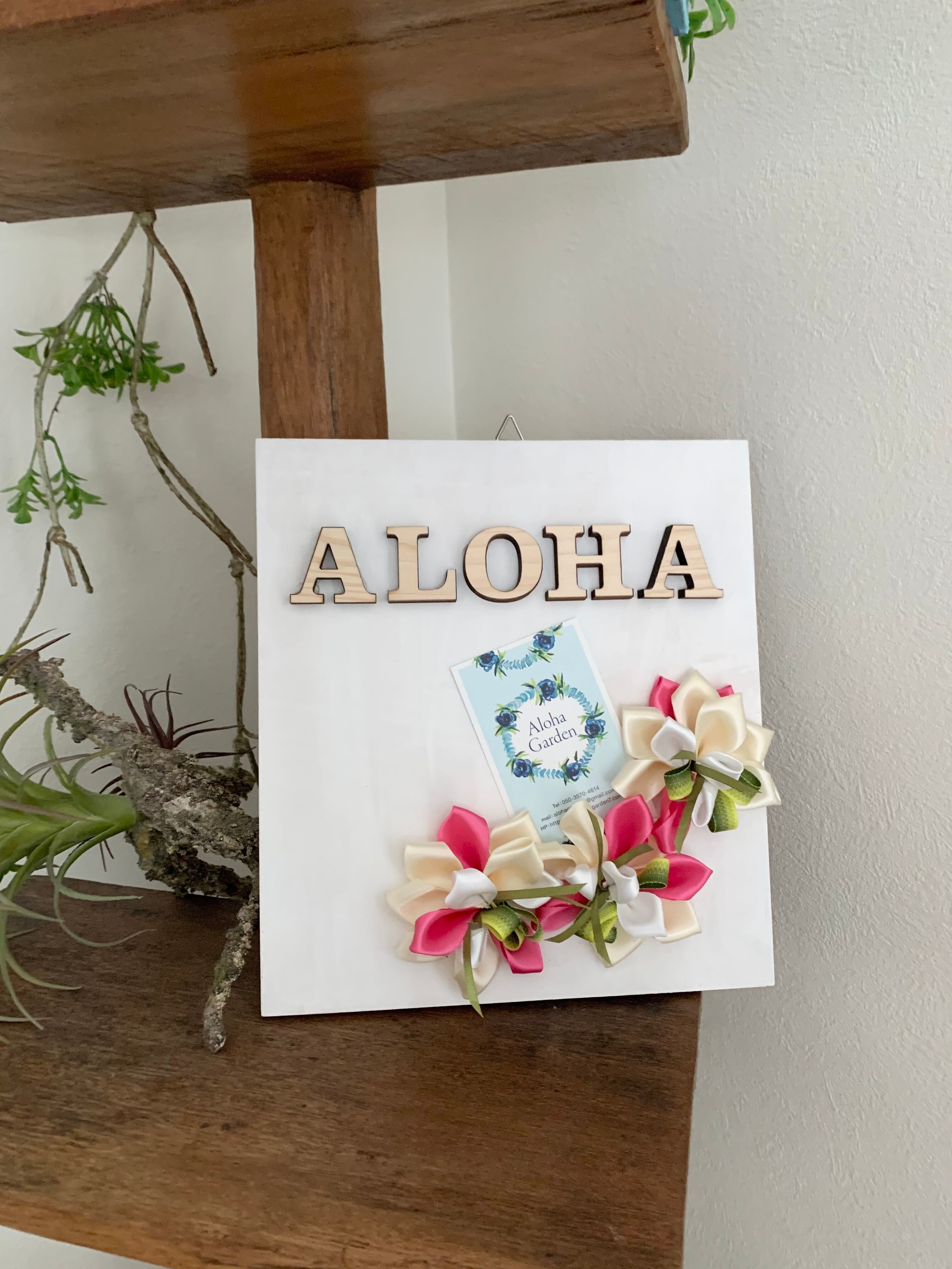 ALOHAの文字と一緒に板にグルーで貼っていただきます。花はお好きな位置に貼ってお楽しみいただけます。