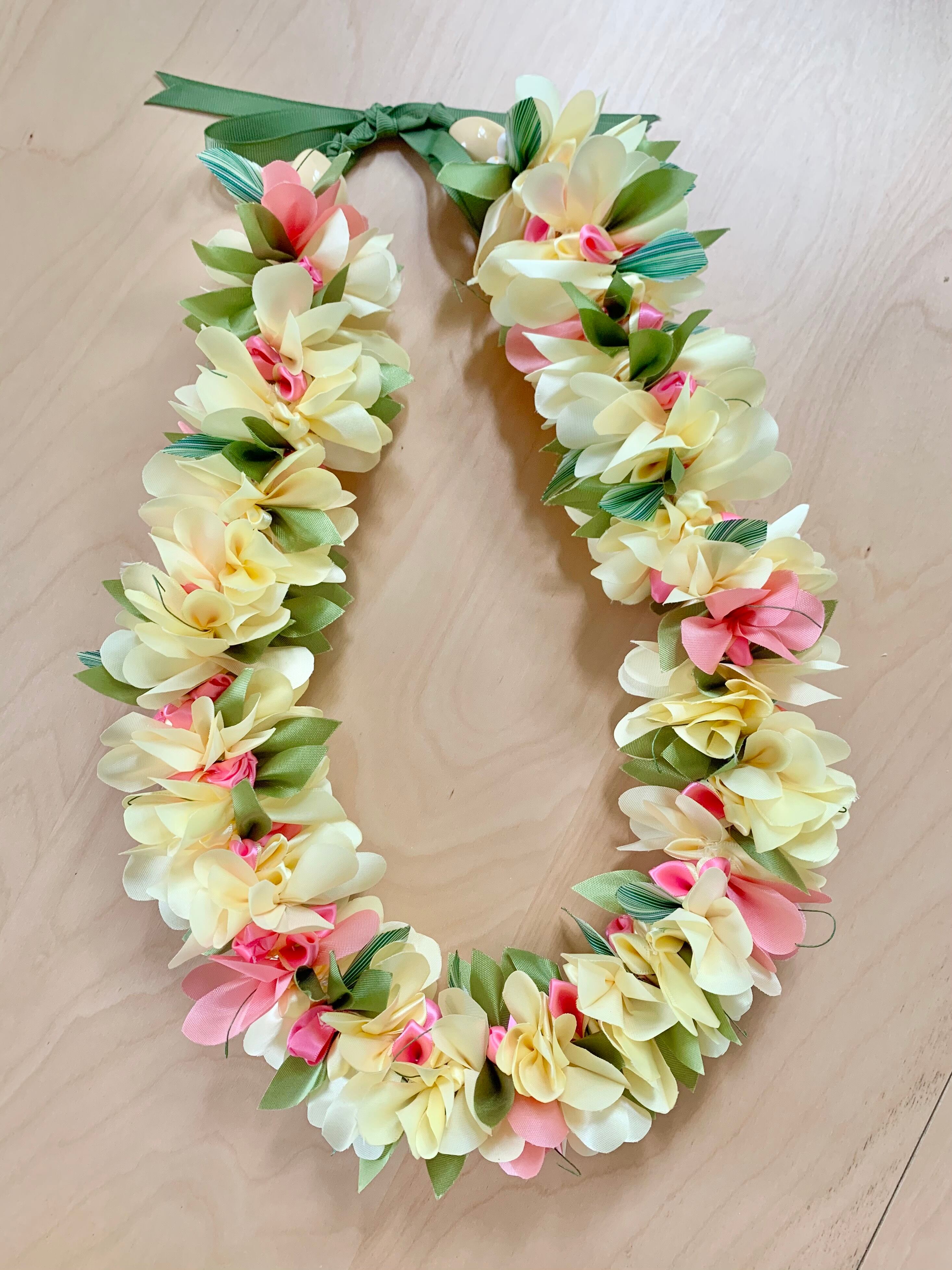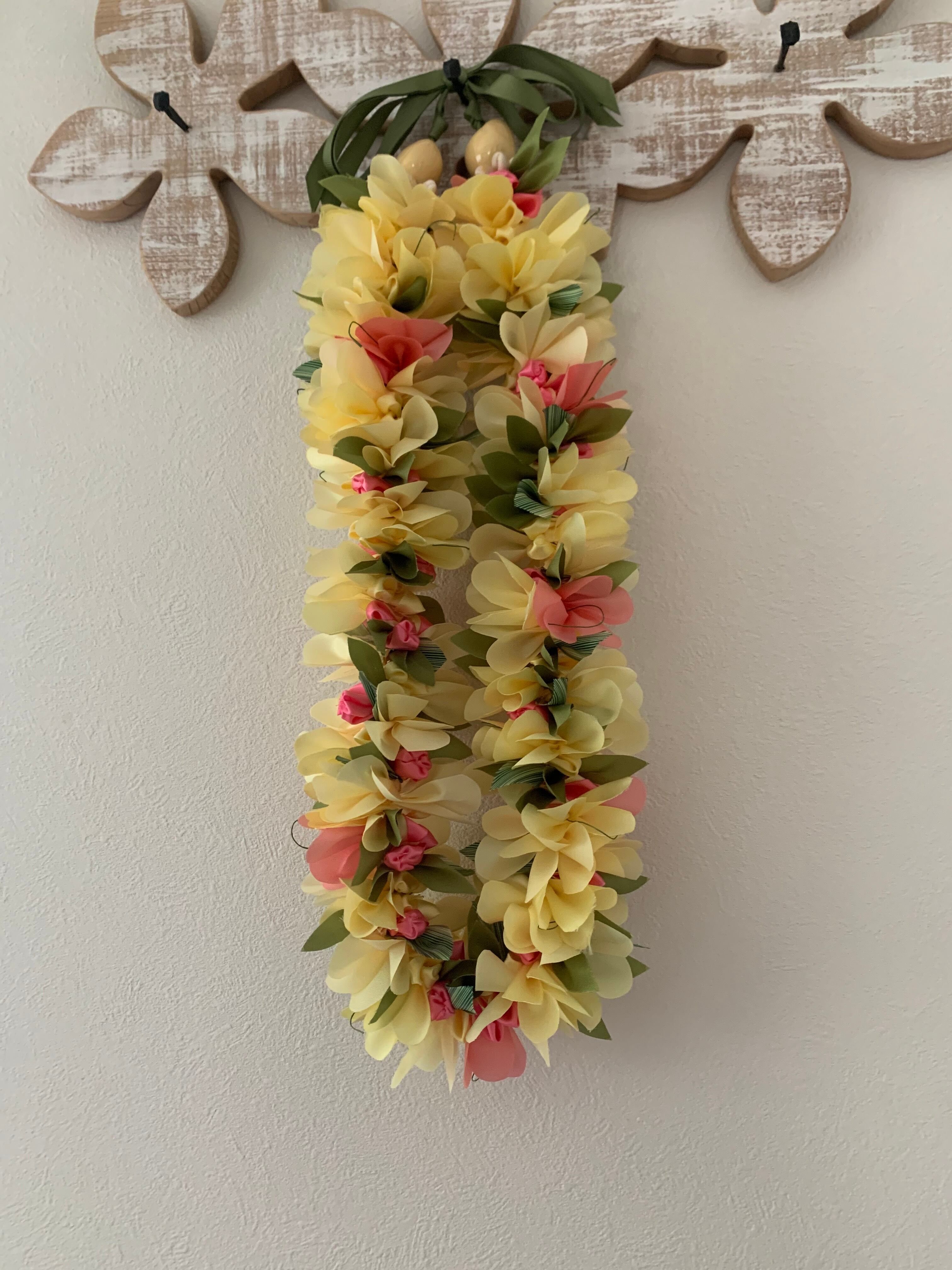 ◆作品説明:ハワイで人気の花の1つシャワーツリーをレイにしました。花の最盛期は7,8月ごろでハワイの公園や観光地で目にすることができます。