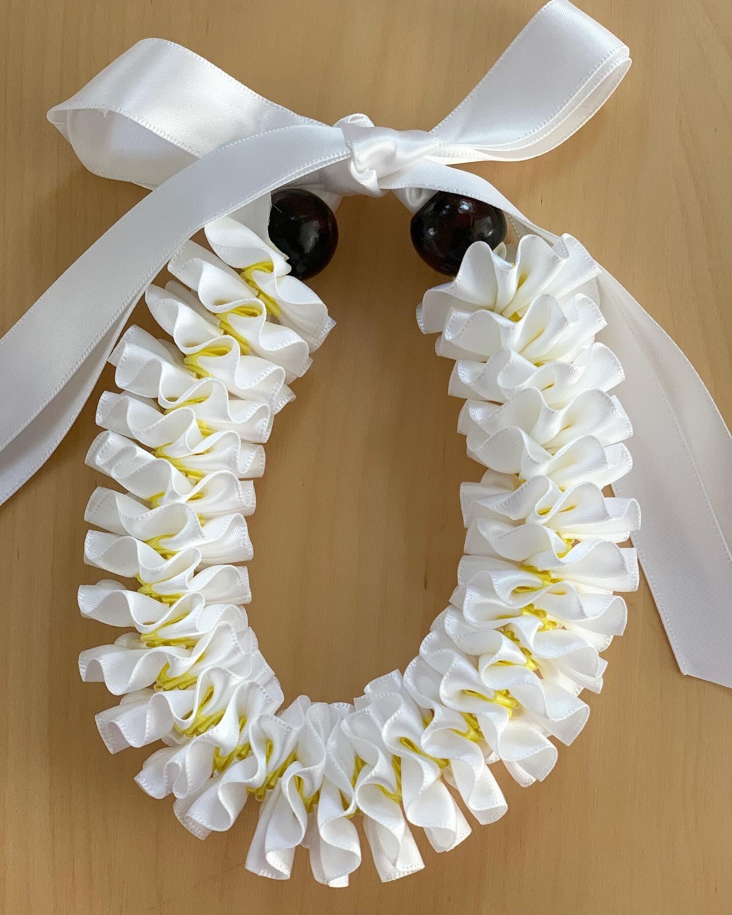 ◆作品説明:プルメリアのレイ。ハワイ好きな飼い主さんなら、愛犬にもぜひレイを!白が基本のお色ですが、他の色もご要望承ります。お買い上げの際にご依頼ください。
