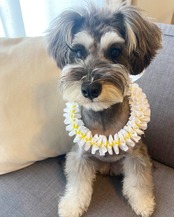 ◆作品説明:プルメリアのレイ。ハワイ好きな飼い主さんなら、愛犬にもぜひレイを!白が基本のお色ですが、他の色もご要望承ります。お買い上げの際にご依頼ください。