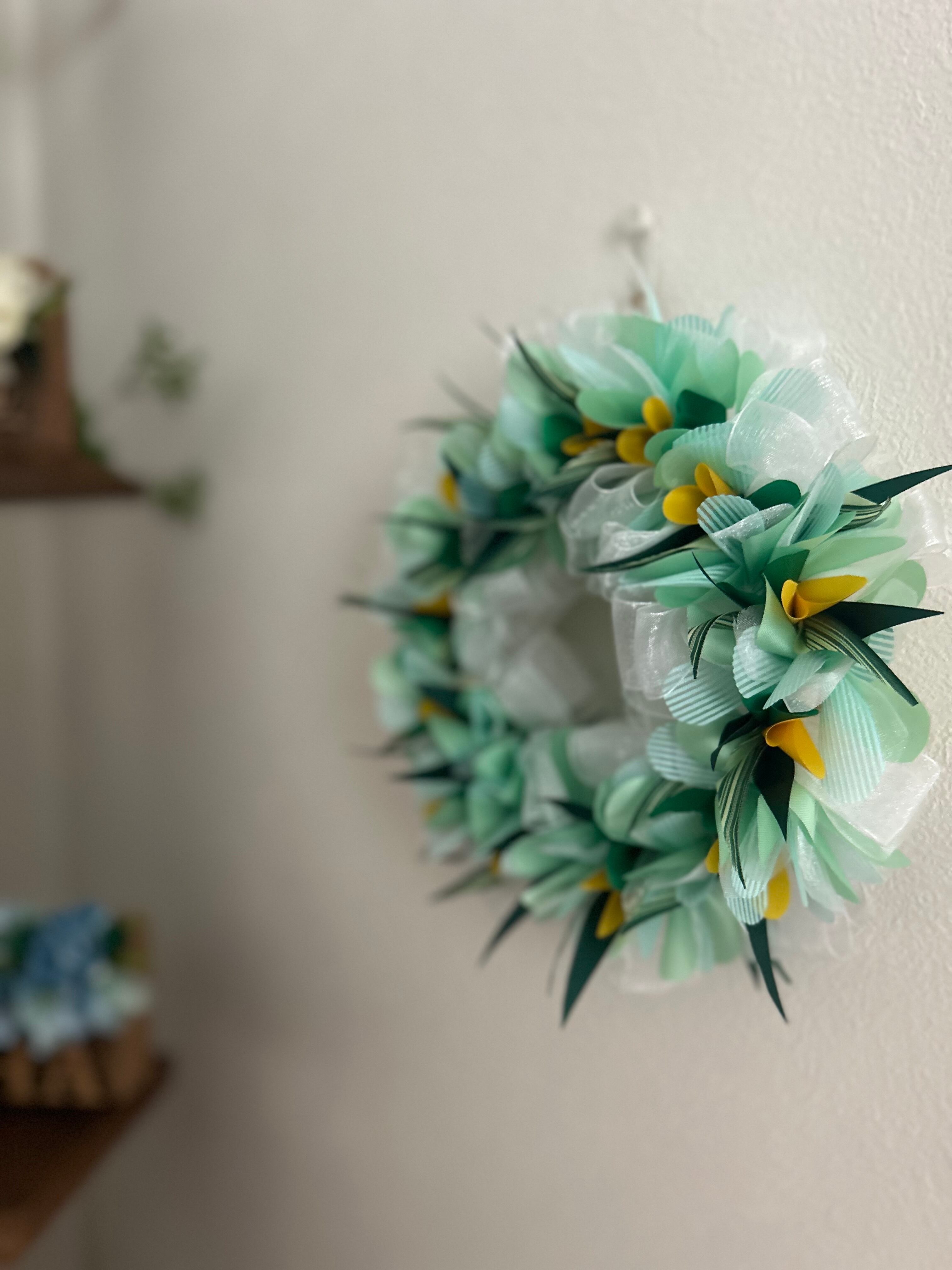 ◆作品説明:オーガンジーが涼しげなリースです。パーツを作り最後はリースの土台に固定します。